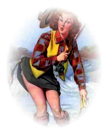| Say hello to Vivian... I first met her on a remote stream in Michigan's Upper Peninsula about forty years ago. As I walked along a high ridge, I suddenly spotted this lovely red head skillfully casting to a riser in the shadow of a log jam. Unknown to her, I sat down to watch... It wasn't long before the pool exploded, and so did Vivian in an eruption of red hair, giggles, and squeals of delight. As she gently released the large brook trout, I worked my way down the slope to "introduce" myself to this lovely girl... Of course, she knew I was watching her all along, for she didn't act a bit surprised as I approached. |